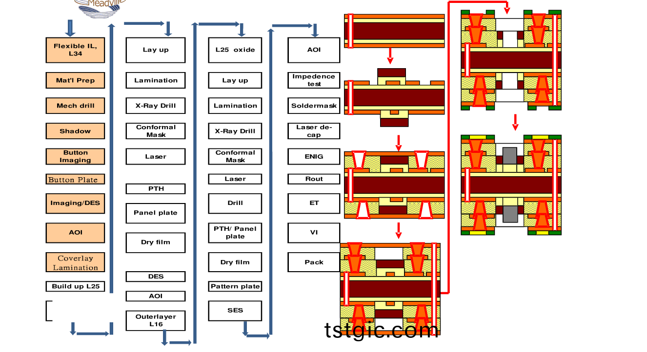 下料→预烘→内层图形转移→内层图形蚀刻→AOI检测→层压内层线路覆盖层→冲定位孔→多层层压→钻导通孔→等离子去钻污→金属化孔→图形电镀→外层图形转移→蚀刻外层图形→AOI检测→层压外层覆盖层或涂覆保护层→表面涂覆→电性能测试→外形加工→检测→包装