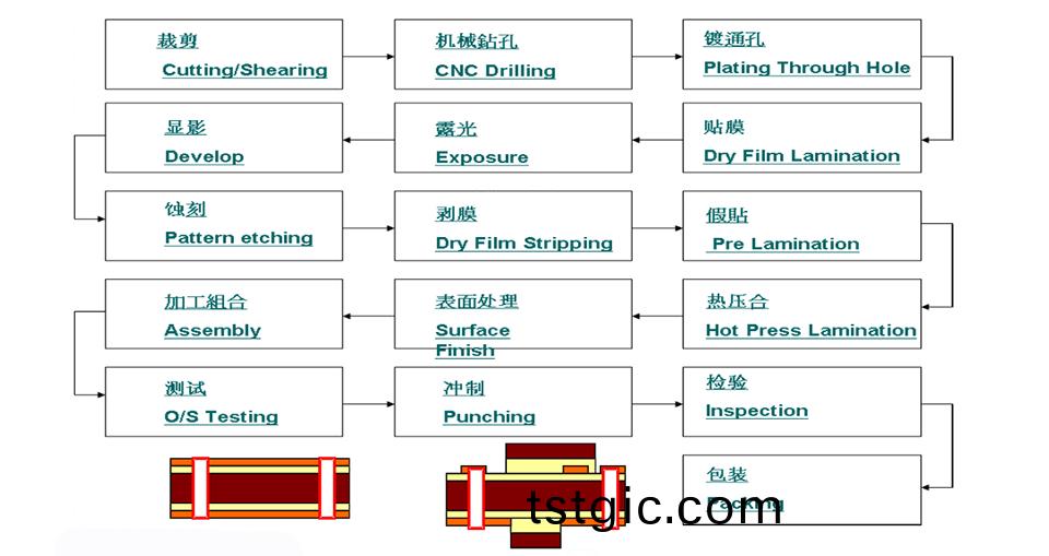 开料→机械钻孔→镀通孔→贴膜→露光→显影→蚀刻→剥膜→假贴→热压合→表面处理→加工组合→测试→冲制→检验→包装